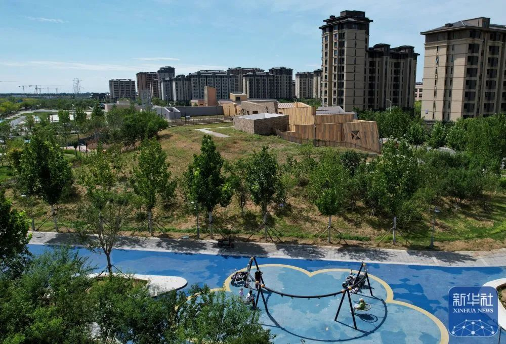↑9月5日拍摄的河北雄安新区“桃源梦境”——段沙 110千伏变电站外景。该变电站设立于云溪公园地下,与城市融合共生(无人机照片)。