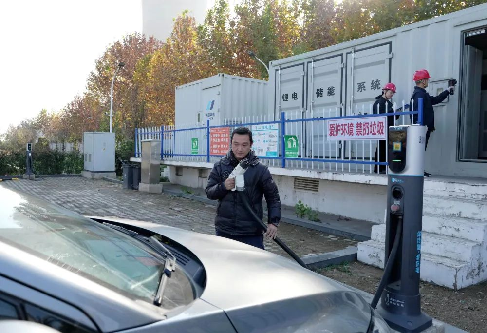 11月27日,市民在石家庄市栾城区装备制造产业园一座储能电站旁,准备给电动汽车充电。新华社记者 杨世尧 摄