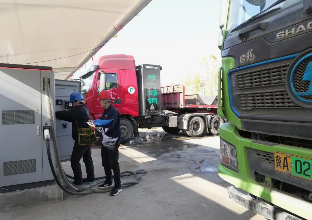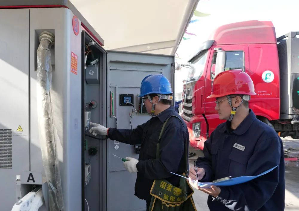 11月27日,工人在石家庄市栾城区装备制造产业园一处重卡充电站巡检。新华社记者 杨世尧 摄