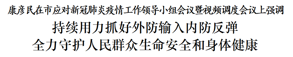 5月9日,我市召开市应对新冠肺炎疫情工作领导小组会议暨视频调度会议,深入贯彻全国疫情防控工作电视电话会议和省应对新冠肺炎疫情工作领导小组会议暨全省视频调度会议精神,安排部署全市疫情防控工作。市委书记、市应对新冠肺炎疫情工作领导小组组长康彦民,市委副书记、市长、市应对新冠肺炎疫情工作领导小组组长向辉出席会议并讲话。市委副书记、市应对新冠肺炎疫情工作领导小组常务副组长张效春出席会议。