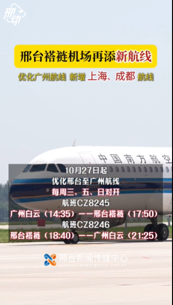 从10月23日市政府新闻办举行的新闻发布会上获悉,10月27日起,邢台褡裢机场开始执行冬春航班计划,新增邢台褡裢—上海浦东、邢台褡裢—成都天府两条航线,优化邢台褡裢—广州白云航班时刻。