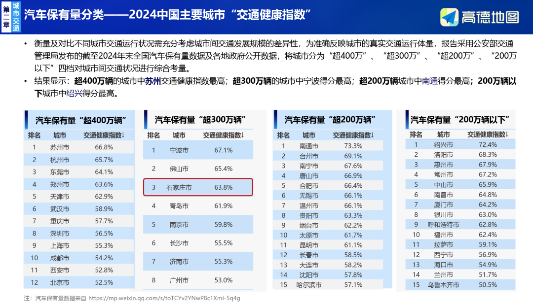 近日,高德地图联合国家信息中心、清华大学、同济大学等机构发布的《2024年中国主要城市交通分析报告》显示,在全国50个主要城市中,石家庄交通拥堵指数同比下降6.28%,下降幅度排名第二;交通健康指数在“汽车保有量超300万辆”同类城市中排名第三;高峰平均车速为30.24公里/小时,位居第四。