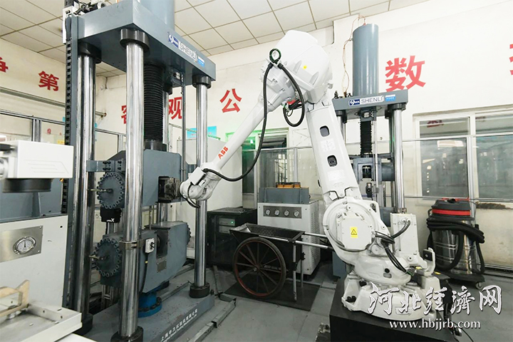 “敬业蓝”螺纹钢。受访单位供图 这座矮塔斜拉桥全长526.7米,塔高66.5米,是雄忻高铁全线重要的控制性工程,采用双塔双索面预应力混凝土矮塔斜拉桥设计。建设过程中,不仅面临跨越南水北调干渠一级水源保护区的环保挑战,还需攻克大体积混凝土浇筑等技术难题。 “我们生产的‘敬业蓝’螺纹钢采用不穿水工艺,精准添加钒、锰合金,外观精美,防锈能力强,兼具高强度和高韧性。”敬业集团雄安新区业务经理史晓鹏说,“敬业蓝”经受住了大体积混凝土浇筑时的严苛考验,保障了矮塔斜拉桥结构的稳固性与耐久性。 风驰电掣的中国高铁,跑出了强国速度。敬业集团生产的高质量螺纹钢,为“300公里+”的高铁时速提供了坚实的基础支撑。 螺纹钢全自动一拖二拉伸机试验机器人。受访单位供图 为提高螺纹钢质量检测精度,确保高质量,敬业集团引进螺纹钢全自动一拖二拉伸机试验机器人。“只需轻点启动程序,机器人的白色机械臂就能精准识别、自动测量、精准刻线、智能拉伸等螺纹钢质量全流程检测,检测数据实时上传到系统,检测效率提升1倍,精度提高0.5%。”敬业集团本部计量质检部部长曹建虎介绍。 助力雄安新区“拔节生长”,敬业集团根据雄忻高铁工程需要,精准定制8-12米专属“雄安钢”,提供涵盖规格、材质、包装的全维度专业定制方案,优先生产、优先发货、全程跟踪、一站式配送。截至目前,超50万吨“敬业蓝”高质量螺纹钢已陆续投入雄忻高铁建设,以坚实品质为这条交通大动脉筑牢钢铁脊梁。