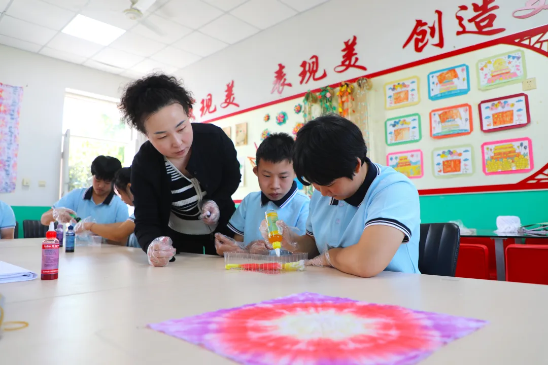 在河北省保定市涞水县特教中心,学生们正在制作扎染