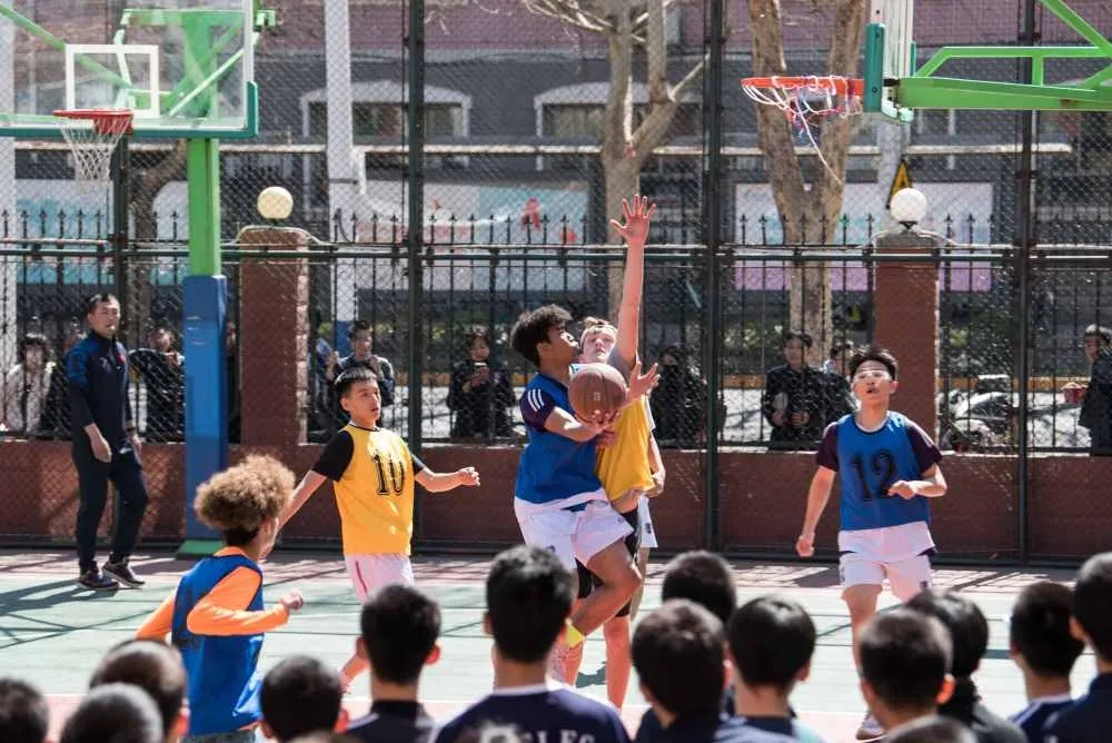 3月19日,中美青少年在石家庄外国语学校打篮球友谊赛。(刘尊拴 摄)