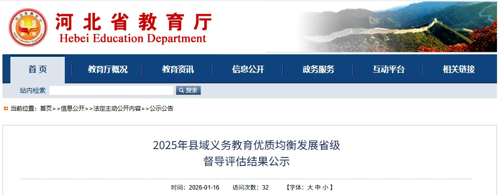 根据教育部《县域义务教育优质均衡发展督导评估办法》和《河北省县域义务教育优质均衡发展督导评估具体办法》规定,河北省教育厅组织评估组对唐山市路南区、开平区、汉沽管理区,石家庄市藁城区、栾城区,承德市宽城满族自治县、平泉市,秦皇岛市昌黎县、北戴河新区,沧州市任丘市、海兴县、青县、沧州经济开发区,张家口市崇礼区,廊坊市大厂回族自治县、廊坊经济技术开发区,保定市高阳县,辛集市等18个县(市、区)进行了督导评估。经综合评估,以上18个县(市、区)基本达到县域义务教育优质均衡发展省级督导评估要求,拟按程序报教育部申请国家评估认定,现予以公示。公示期为2026年1月16日至1月22日。