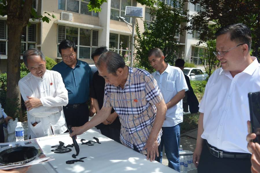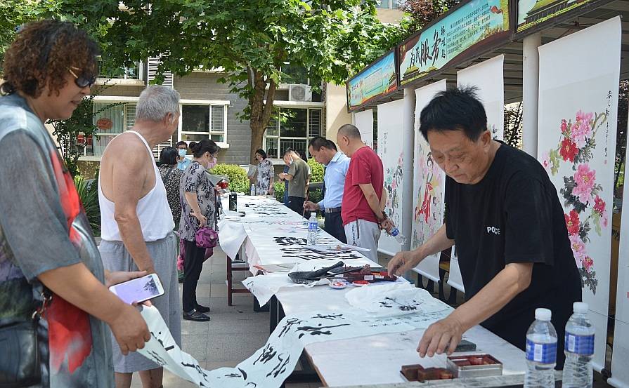 活动现场,书画艺术家挥毫泼墨,并与前来参观的居民和书画爱好者进行交流和创作指导。