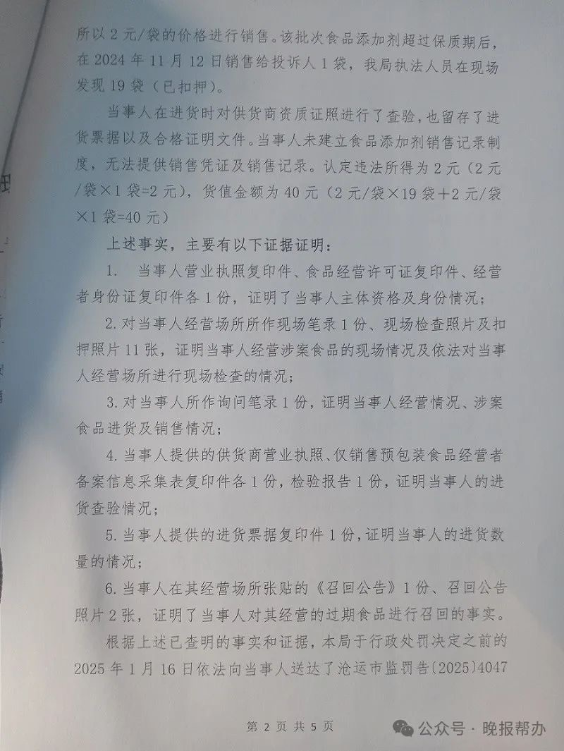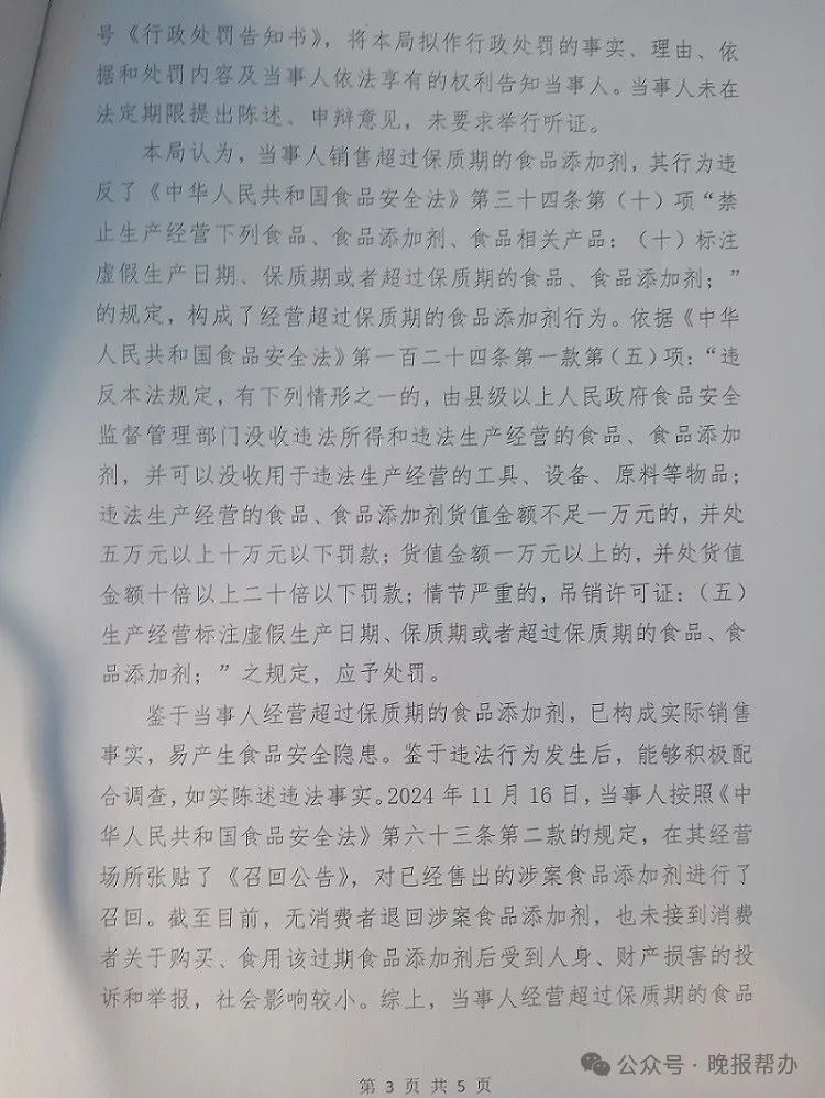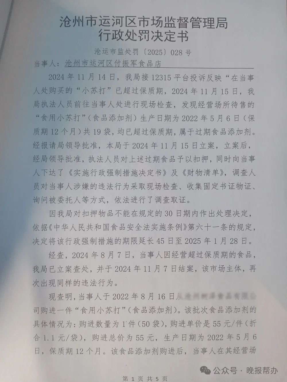 近日,河北省人民政府网站“行政执法公示平台”发布了沧州市运河区市场监督管理局于1月24日作出的“沧运市监处罚〔2025〕028号”行政处罚决定书。2024年11月15日执法人员在沧州市运河区付振军食品店发现待售的“食用小苏打”(食品添加剂)生产日期为2022年5月6日(保质期12个月)共19袋,均已超过保质期。以上行为违反了《中华人民共和国食品安全法》第三十四条第十项的相关规定。沧州市运河区市场监督管理局依据《中华人民共和国食品安全法》第一百二十四条第一款第五项的相关规定,对沧州市运河区付振军食品店作出以下行政处罚:2.没收超过保质期的“食用小苏打”(食品添加剂)19袋;3.处以罚款50000元。