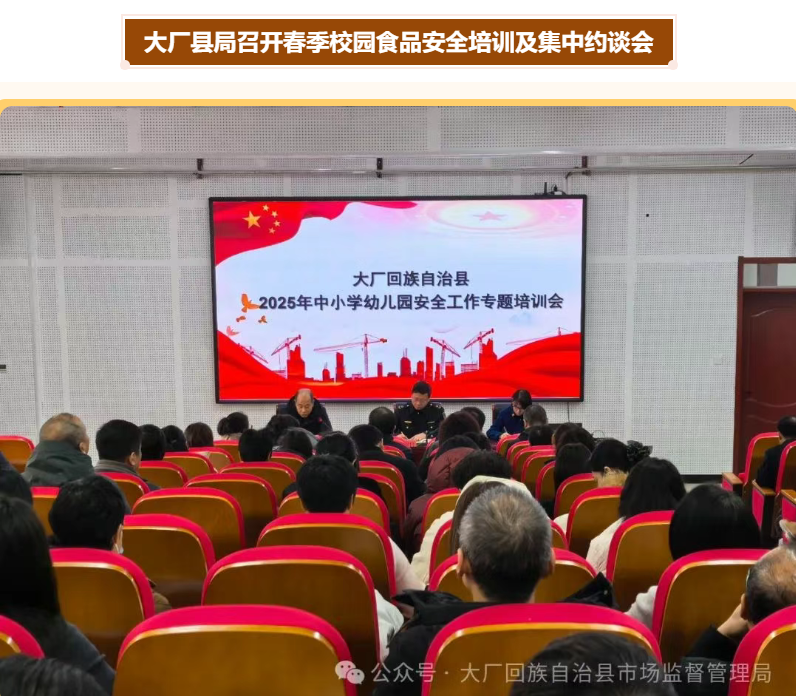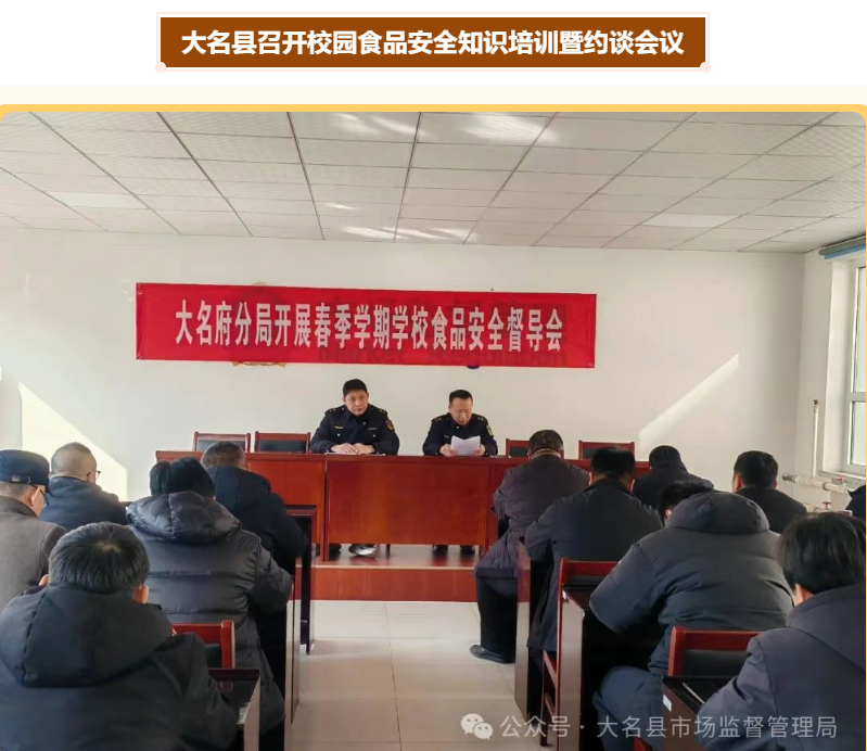 为进一步提升校园食品安全意识,有效防范校园食品安全风险,近日,大名县市场监管局组织召开校园食品安全知识培训暨约谈会议。会议围绕健康管理、环境卫生、“明厨亮灶”、索证索票、食品贮存、过程控制、餐用具洗消保洁、食品留样以及餐厨废弃物处置等关键风险点进行了危害分析,要求各学校负责人强化责任意识,更新完善“三防”设备设施,及时开展自查自纠,确保师生用餐安全。(大名县局微信公众号)