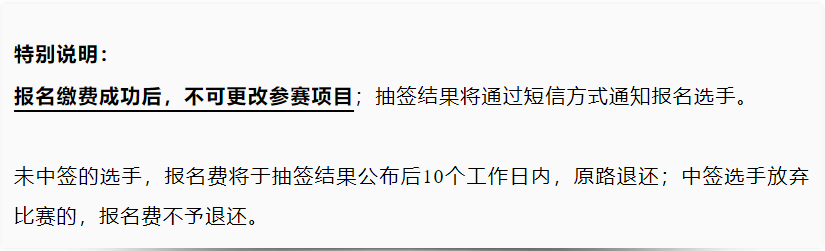 马拉松项目、半程马拉松项目采用「先报名缴费,后抽签」的方式,健康跑项目采用「先报先得,额满截止」的方式。
