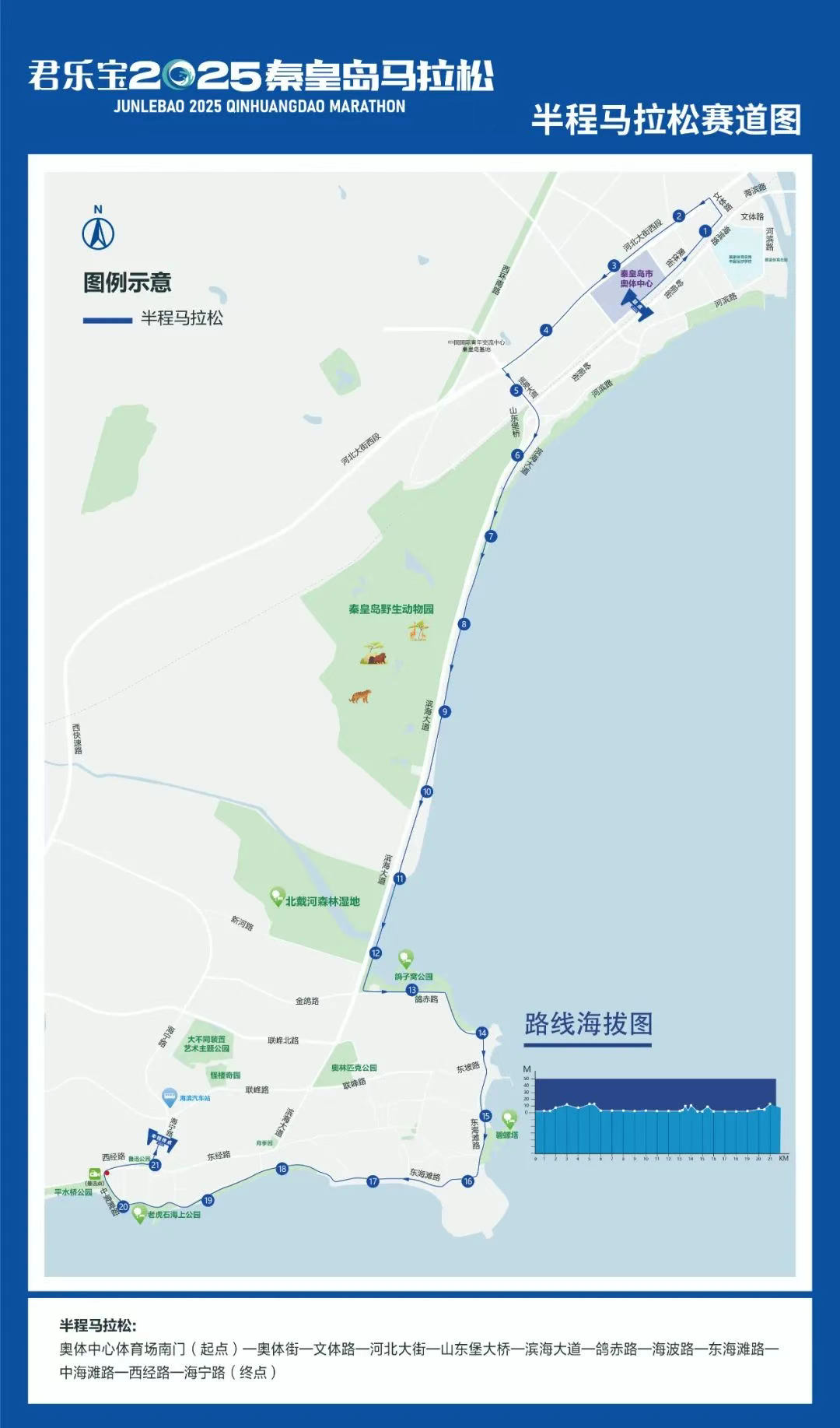 (二)半程马拉松项目奥体中心体育场南门(起点)—奥体街—文体路—河北大街—山东堡大桥—滨海大道—鸽赤路—海波路—东海滩路—中海滩路—西经路—海宁路(终点)。