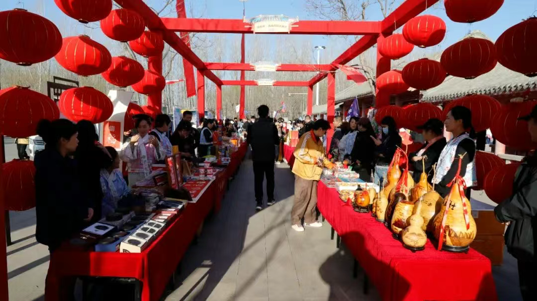 活动现场,满族风情大庙会成为一大亮点。30余个特色展位,展示并售卖易水砚、绞胎瓷、满族结绳等非遗文创产品,以及冰柿、牛岗苹果等易县特色农副产品。