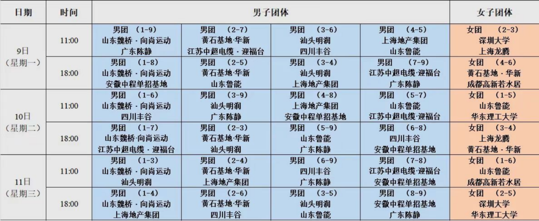 本次赛事共15家俱乐部参赛,其中男子俱乐部9家、女子俱乐部6家。每个比赛日分别设置日场(11:00开赛)和夜场(18:00开赛)。