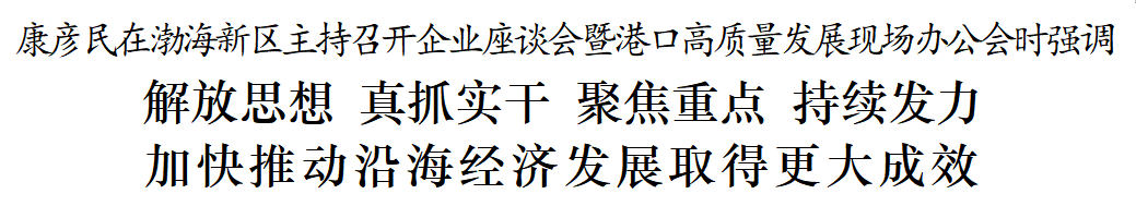 5月24日,市委书记康彦民在渤海新区主持召开企业座谈会暨港口高质量发展现场办公会。他强调,要坚持以习近平新时代中国特色社会主义思想为指导,深入贯彻党中央、国务院决策部署和省委、省政府工作要求,全面落实省委书记倪岳峰来沧调研讲话精神,解放思想、真抓实干,聚焦重点、持续发力,加快推动沿海经济发展取得更大成效。市委副书记、市长向辉出席会议。