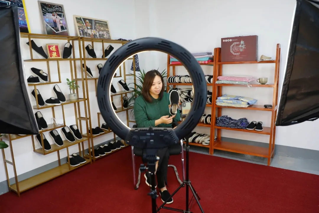 ↑任泽区电商直播创业者王玲在通过网络直播推荐手工布鞋。(宋杰、徐乐陶 摄)
