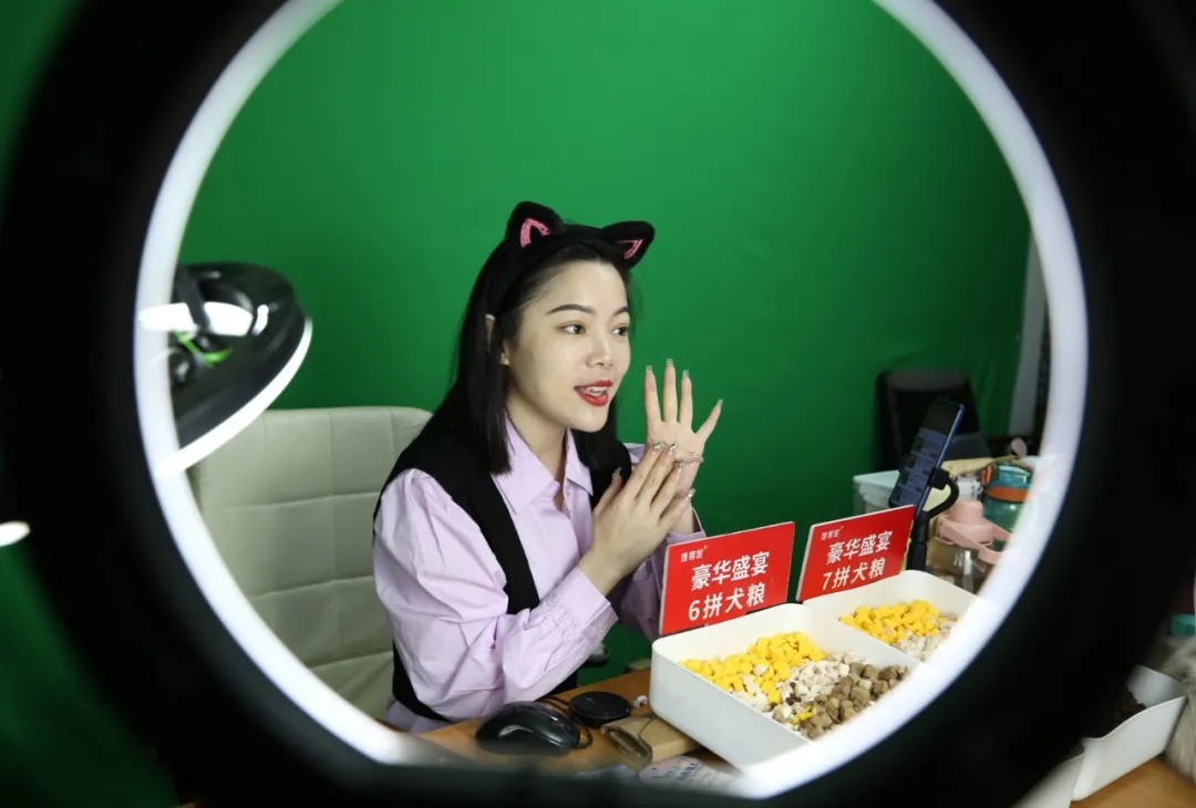 ↑位于南和区河郭镇的一家宠物食品企业,主播在通过网络直播销售产品。(武国栋 摄)