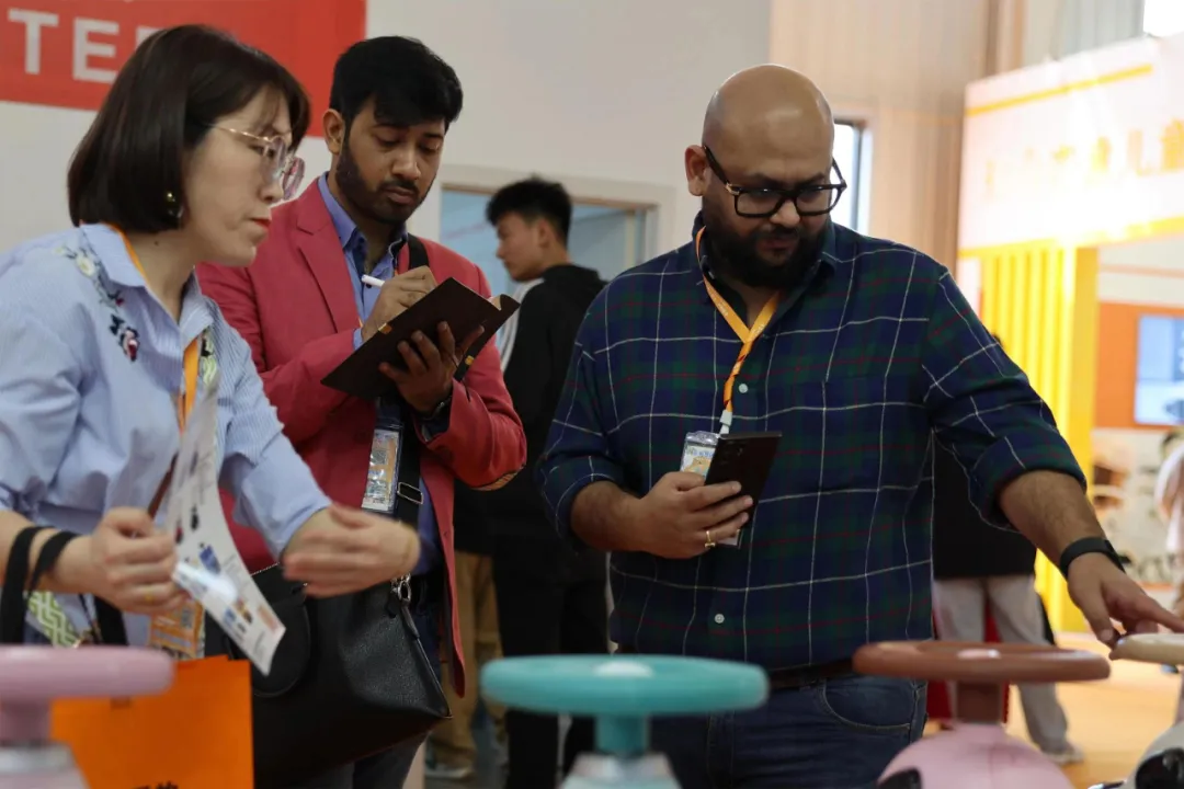 第十七届中国·北方(平乡)国际自行车童车玩具博览会上,客商在博览会上选购产品。陈雷 田晓丽摄