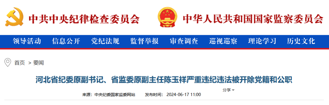 据中央纪委国家监委网站2024年6月17日消息,陈玉祥严重违纪违法被开除党籍和公职。