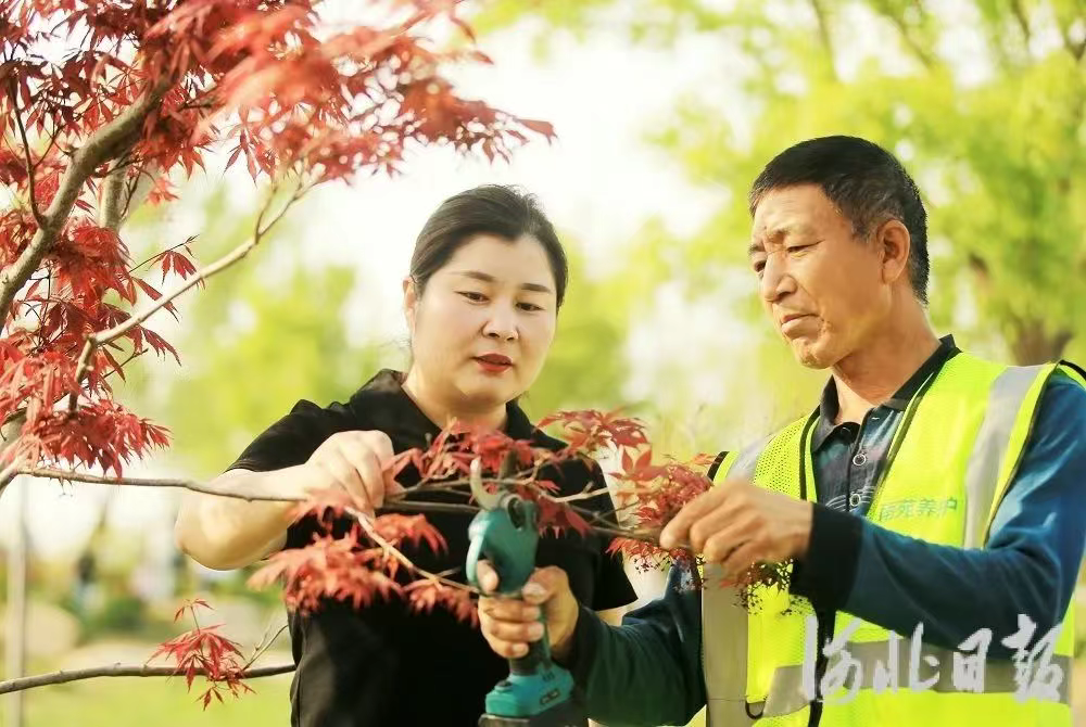 近日,武芳芳(左)在悦容公园内指导园林工人进行剪枝。河北日报记者刘光昱摄