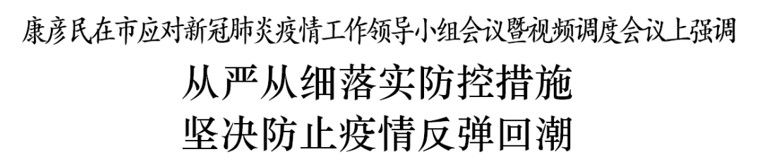 会议指出,各级各部门要深入贯彻习近平总书记重要指示精神,全面落实党中央、国务院决策部署和省委、省政府工作要求,坚持“外防输入、内防反弹”总策略不动摇,从严从细推动各项防控措施落地落实,坚决防止疫情反弹回潮。