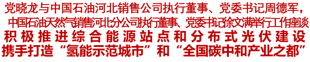 5月30日,市委书记党晓龙与中国石油河北销售公司执行董事、党委书记周德军,中国石油天然气销售河北分公司执行董事、党委书记徐文满举行工作座谈,深入落实党中央关于“双碳”工作部署,围绕综合能源站点打造、非油品业务发展、成品油质量管控等方面进行深入交流。党晓龙强调,要积极推进综合能源站点和分布式光伏建设,携手打造“氢能示范城市”和“全国碳中和产业之都”,赋能保定创新发展、绿色发展、高质量发展。