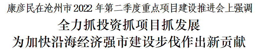 6月15日,沧州市2022年第二季度重点项目建设推进会在青县召开。市委书记康彦民在会上强调,要深入贯彻全国稳住经济大盘电视电话会议和省委十届二次全会精神,全面落实省委书记倪岳峰、省长王正谱讲话要求,推动全市上下解放思想、奋发进取,强力推动项目建设,不断扩大有效投资,确保主要经济指标争先进位,为加快沿海经济强市建设步伐作出新贡献。市委副书记、市长向辉出席并讲话,市人大常委会主任宋有洪、市政协主席王晓燕、市委副书记张效春出席。市委常委、常务副市长和春军通报相关情况。