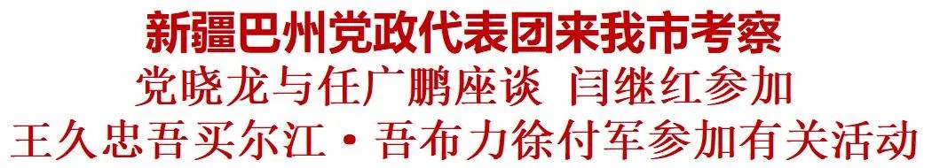7月3日,新疆巴州党政代表团来我市考察。市委书记党晓龙与巴州党委书记,兵团第二师党委第一书记、第一政委任广鹏座谈。市委副书记、市长闫继红参加。巴州人大常委会党组书记、副主任王久忠,巴州政协党组副书记、主席吾买尔江·吾布力,巴州党委副书记、河北省援疆工作前方指挥部指挥长徐付军参加有关活动。