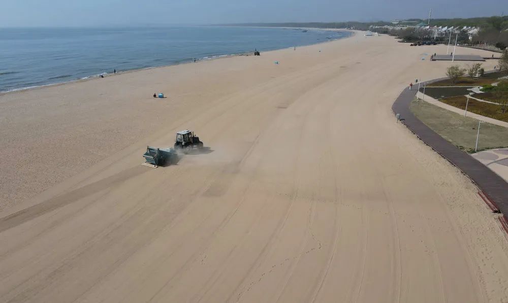 ↑4月23日,工人在秦皇岛市海港区金梦海湾浴场使用机械设备过滤海滩上的沙子(无人机照片)。新华社记者 杨世尧 摄