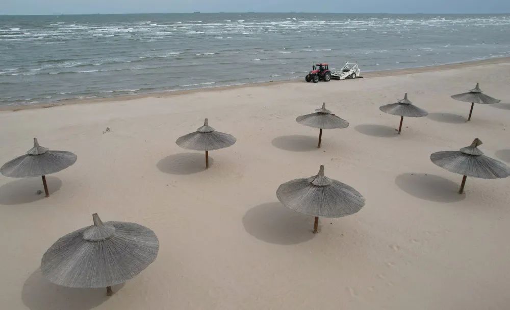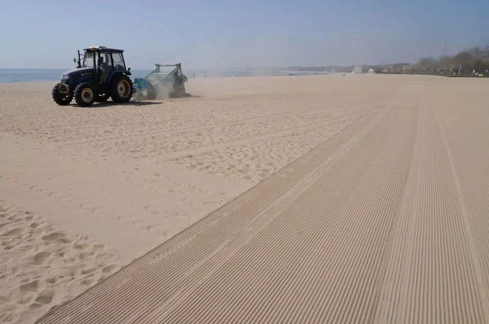 近日,旅游胜地河北省秦皇岛市各浴场的工人开始对浴场的沙滩进行整理,精筛细沙,检修旅游设备,准备迎接八方来客。