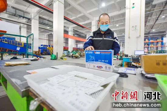 图为廊坊市广阳经济开发区中国邮政廊坊环渤海集散中心,工作人员为邮件进行整理。付瑞琪