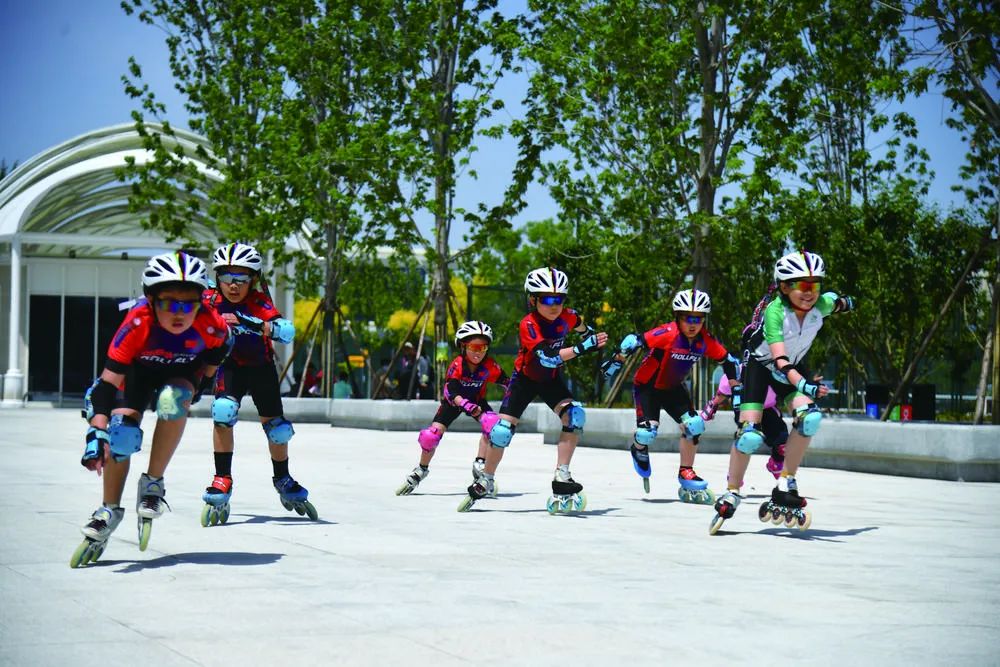 孩子们在石家庄高铁片区中央绿色体育公园进行轮滑训练。