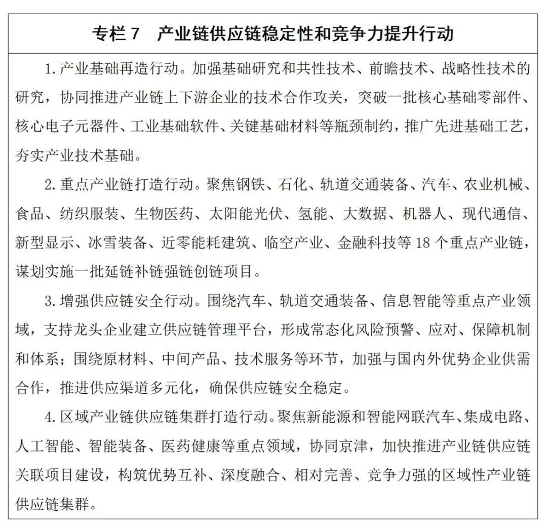 2.提升产业链竞争力。提升产业链现代化水平。聚焦钢铁、石化、高端装备、生物医药、信息智能、新能源等领域18个重点产业链,打好产业基础高级化和产业链现代化攻坚战。对标行业先进水平,改造提升钢铁、石化、轨道交通装备、汽车、农业机械、食品、纺织服装等传统产业链,巩固提升竞争优势;培育引进一批产业链核心企业,加快实施一批产业化示范项目,完善配套生物医药、太阳能光伏、氢能、大数据、机器人、现代通信、新型显示等战略性新兴产业链,培植竞争新优势。