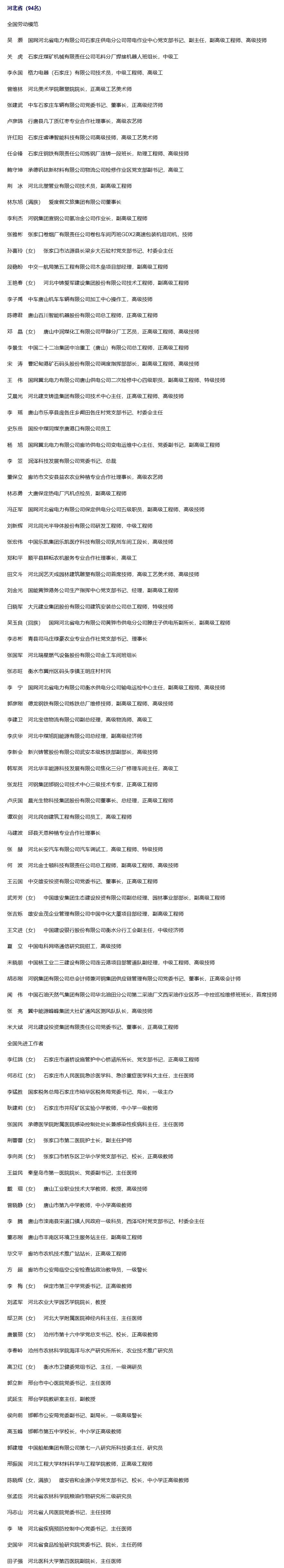 党中央、国务院决定,开展全国劳动模范和先进工作者评选表彰,表彰近年来在我国经济建设、政治建设、文化建设、社会建设、生态文明建设和党的建设等方面作出重大贡献,取得突出成绩的工人、农民、科教人员、管理人员、机关工作人员及其他劳动者。根据工作部署,经自下而上、层层选拔、好中选优,确定1677名全国劳动模范和762名全国先进工作者拟表彰对象。为充分发扬民主、广泛听取意见、接受社会监督,现将拟表彰对象予以公示,公示时间从2025年3月30日起,至4月3日止。如对拟表彰对象有异议,请于公示期间通过电话、邮件、信函(以到达日邮戳为准)等方式向党和国家功勋荣誉表彰工作委员会办公室反映。以单位名义反映情况的材料需加盖单位公章,以个人名义反映情况请告知或签署实名,并提供联系电话。电话:(010)68591891,68591892通信地址:北京市西城区复兴门外大街10号(全国总工会)其中,河北94人拟获全国劳动模范和先进工作者表彰: