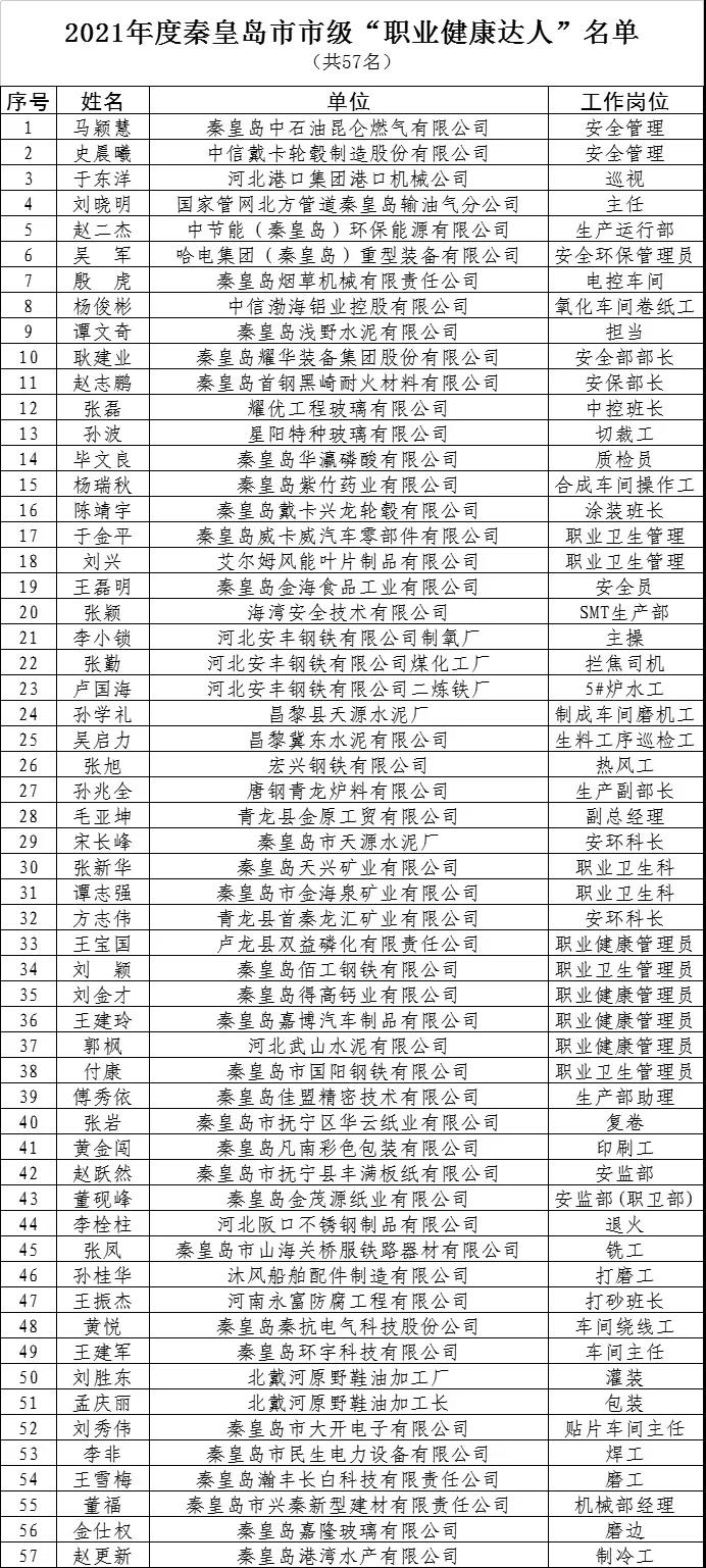 争做“职业健康达人”活动是实施健康秦皇岛战略,推进职业健康保护行动的重要举措。自活动开展以来,全市各用人单位积极加强健康管理,改善劳动环境,开展丰富多样的教育培训、技能知识竞赛等活动,培育发掘了一批“职业健康达人”,有效提高了劳动者职业健康素养和用人单位职业健康管理水平。近日,经用人单位报送、县区推荐审核、市级评审等环节,共评选出2021年度市级“职业健康达人”57名。