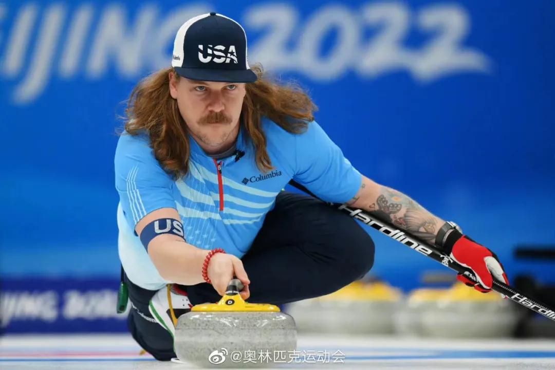 一头长发,美国冰壶选手马特·汉密尔顿吸引了众多观众的目光。