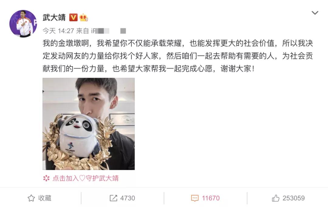 2月20日,武大靖在社交平台发文,决定让自己唯一的“金墩墩”发挥更大的社会价值。他表示,“初步想法是进行拍卖,去帮助有需要的人。”