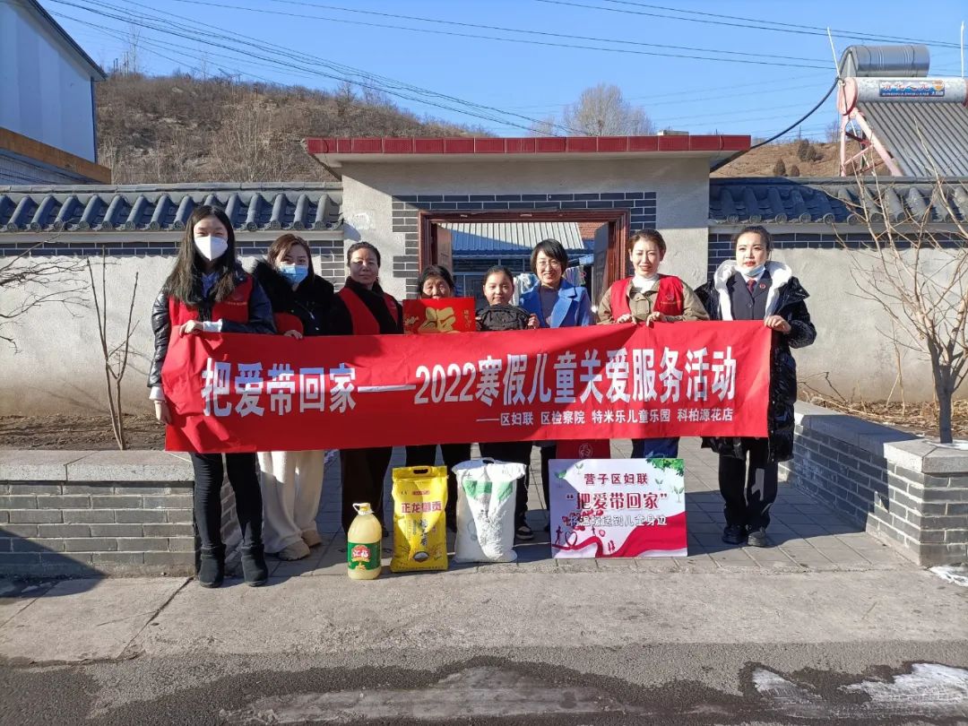 营子区妇联组织妇联工作人员、检察院巾帼志愿者、巾帼建功标兵、特米乐儿童乐园的爱心人士以及大学生社会实践人员组成巾帼志愿者服务队,为区内5户留守儿童、困境儿童、孤儿送去1000元救助款和米、面、油、学习用品、电子手表、普法知识手册等物品。