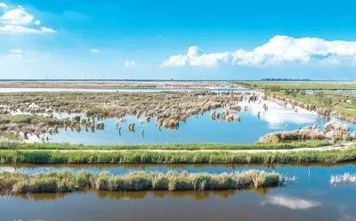 蓝天白云下的南大港湿地。殷实摄