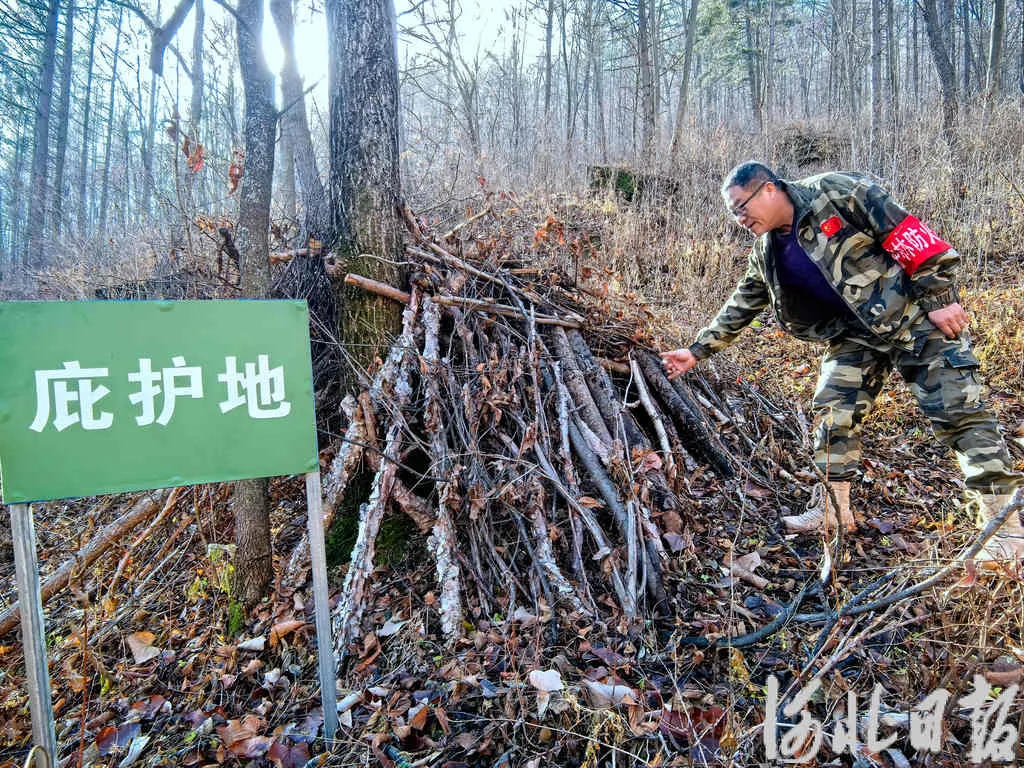 11月15日,木兰林场新丰分场副场长于泊巡查为动物修建的庇护所。河北日报记者陈宝云摄