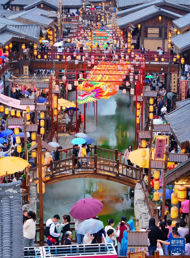游客在湖南省衡阳市南岳区“南岳里”庙会民俗美食街区游玩,乐享假日美好时光(10月1日摄,无人机照片)。