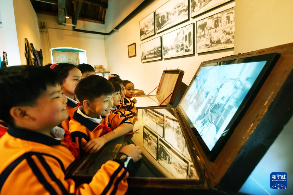 山东青岛顺兴路小学的孩子们走进大鲍岛里院记忆博物馆参观(10月1日摄)。