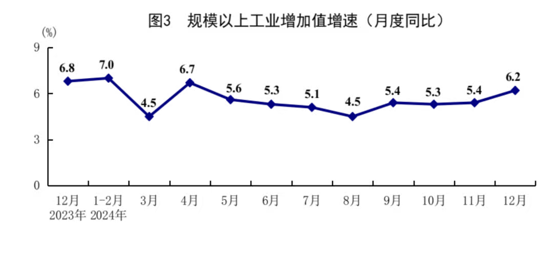 全年全国规模以上工业增加值比上年增长5.8%。分三大门类看,采矿业增加值增长3.1%,制造业增长6.1%,电力、热力、燃气及水生产和供应业增长5.3%。装备制造业增加值增长7.7%,高技术制造业增加值增长8.9%,增速分别快于规模以上工业1.9、3.1个百分点。分经济类型看,国有控股企业增加值增长4.2%;股份制企业增长6.1%,外商及港澳台投资企业增长4.0%;私营企业增长5.3%。分产品看,新能源汽车、集成电路、工业机器人产品产量分别增长38.7%、22.2%、14.2%。四季度,规模以上工业增加值同比增长5.7%。12月份,规模以上工业增加值同比增长6.2%,环比增长0.64%。1—11月份,全国规模以上工业企业实现利润总额66675亿元,同比下降4.7%。