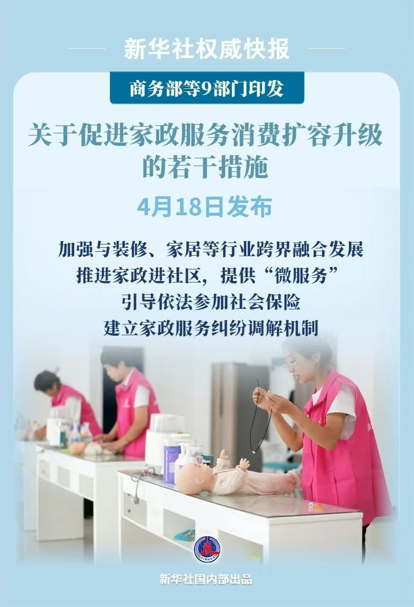 商务部等9部门近日印发关于促进家政服务消费扩容升级的若干措施,4月18日对外发布。一系列举措围绕提升家政服务供给质量、促进家政服务便利消费、完善家政服务业支持政策、优化家政服务消费环境等4方面展开,促进家政服务消费扩容升级。 其中,明确提出鼓励家政服务企业拓展专业深度保洁、室内空气治理、营养咨询等新兴服务领域,加强与装修、家居等行业跨界融合发展。以社区网点为依托,发掘“微需求”,提供“微服务”,满足消费者共享保洁、烹饪、接送等家政服务需求。引导家政服务企业和家政服务人员依法参加社会保险,推动符合条件的灵活就业家政服务人员在就业地参加社会保险。建立健全常态化、多元化家政服务纠纷调解机制,营造良好行业发展环境。 一起来看文件原文 商服贸函〔2025〕76号 国家发展改革委、教育部、工业和信息化部、公安部、民政部、财政部、人力资源社会保障部、住房城乡建设部、商务部、中国人民银行、市场监管总局、金融监管总局、国家医保局、全国妇联,各省、自治区、直辖市及计划单列市、新疆生产建设兵团商务、发展改革、教育、工业和信息化、公安、民政、财政、人力资源社会保障、住房城乡建设、市场监管部门、金融监管局、医保局、妇联,中国人民银行上海总部,各省、自治区、直辖市及计划单列市分行: 为深入贯彻落实党中央、国务院关于发展服务消费的决策部署,支持家政服务消费,更好满足人民美好生活需要,商务部、国家发展改革委、教育部、公安部、民政部、财政部、人力资源社会保障部、市场监管总局、国家医保局等9部门,会同工业和信息化部、住房城乡建设部、中国人民银行、金融监管总局、全国妇联共同研究,制定了促进家政服务消费扩容升级的若干措施,现将有关事项通知如下。 一、总体要求 以习近平新时代中国特色社会主义思想为指导,全面贯彻落实党的二十大和二十届二中、三中全会精神,完整准确全面贯彻新发展理念,统筹扩大内需和深化供给侧结构性改革,坚持市场为主、政府引导,健全家政服务业支持政策,优化家政服务业发展环境,加强家政服务信用体系建设,充分发挥我国人力资源优势,扩大优质家政服务供给,推进家政服务业提质扩容,积极培育服务消费新增长点,更好满足人民群众高品质生活服务需求。 二、提升家政服务供给质量 (一)扩大优质家政服务供给。鼓励家政服务企业拓展专业深度保洁、整理收纳、家具家电清洗、室内空气治理、消杀消毒、营养咨询等新兴服务领域,加强与装修、家居等行业跨界融合发展,进一步丰富产品和服务供给,更好满足消费者个性化、品质化、多元化需求。深入实施家政兴农行动,深化家政劳务输出与输入地供需对接合作,支持地方打造家政劳务特色品牌。加强产教融合、校企合作,发挥高职院校作用,支持高职院校和企业共建实训基地,培养一批符合家政行业中高端需求的专业化、职业化、高素质技能人才。 (二)推动家政服务品牌化发展。鼓励行业协会、有关机构依据相关国家标准对家政服务企业开展等级划分和评定。引导家政服务企业建立健全管理体系、培训体系、质量评价体系,发展连锁经营、商业特许经营,培育一批具有引领作用的家政龙头企业。鼓励各类社会资本加大对家政服务业的投资,引入先进管理经验,推动行业整合与优化。推进巾帼家政品牌建设,支持举办行业职业技能竞赛,鼓励各地方、行业协会开展家政服务品牌展示推广活动,提升品牌企业知名度和影响力。 (三)提升家政服务技能水平。加强家政行业发展趋势分析,及时研判家政行业用工需求,支持各地根据实际情况将紧缺的家政服务相关职业(工种)纳入本地急需紧缺职业、就业需求、培训需求指导目录,组织开展项目化培训,引导劳动者参训就业。建立以就业为导向的家政服务培训体系,加强培训与岗位需求有效衔接。依托“家政信用查”平台,持续开展家政服务员技能升级行动,扩大免费线上培训覆盖面。实施巾帼家政提质扩容技能提升工程,积极开展多渠道、多层次、多类型职业培训。 三、促进家政服务便利消费 (四)优化家政服务消费设施布局。持续开展一刻钟便民生活圈和城市社区嵌入式服务设施建设,加快配齐家政等保障类业态。推进家政进社区,支持家政企业连锁化运营社区网点。鼓励家政服务企业创新服务模式,提供点单式、分时段服务,以社区网点为依托,发掘“微需求”,提供“微服务”,满足消费者共享保洁、烹饪、接送等家政服务需求。推动“家政+养老”融合发展,支持家政服务企业与社区养老服务机构建立紧密协作关系,符合条件的家政服务企业可依法参与承接政府购买居家养老上门服务。 (五)加快家政服务业数字化发展。支持家政服务企业加快数字化转型,利用数字技术提高供需匹配效率和消费者参与度,实现消费者家政服务方案的个性化设计、服务过程的全程参与、服务结果的评价与分享。支持家政服务企业与数字技术企业跨界合作,利用大数据、人工智能等技术开展用户画像、精准服务,依托机器人等新技术、新设备拓展家政服务消费场景。培育平台型互联网家政企业,提升行业管理效能、服务效率和数字化服务水平。 四、完善家政服务业支持政策 (六)完善财政金融支持政策。支持家政企业结合
