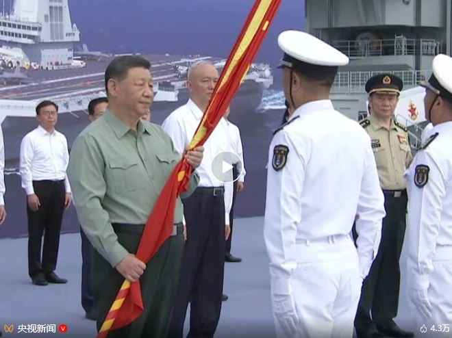 我国第一艘电磁弹射型航空母舰福建舰入列授旗仪式5日在海南三亚某军港举行。中共中央总书记、国家主席、中央军委主席习近平出席入列授旗仪式并登舰视察。十一月的三亚,海阔天高,碧波浩瀚。军港内,福建舰踏海而立、满旗高悬,山东舰伏波相伴,来自海军部队和航母建设单位的代表2000余人在码头整齐列队,气氛隆重热烈。下午4时30分许,入列授旗仪式开始,全场高唱中华人民共和国国歌,五星红旗冉冉升起。仪仗礼兵护卫着八一军旗,正步行进到主席台前。习近平将八一军旗授予福建舰舰长、政治委员。福建舰舰长、政治委员向习近平敬礼,从习近平手中接过八一军旗。习近平同他们合影留念。入列授旗仪式在中国人民解放军军歌声中结束。习近平对我国航母建设发展一直很关注。仪式结束后,习近平登上福建舰,听取我国航母建设发展工作汇报,了解航母体系作战能力生成、电磁弹射系统建设运用等情况。宽阔的飞行甲板上,4道阻拦索、3个弹射起飞位格外醒目,歼-35、歼-15T、空警-600等新型舰载机依次停放。习近平听取甲板功能布局介绍,不时驻足察看装备设施。习近平同舰载机飞行员亲切交流,详细询问飞机技战术性能和电磁弹射特点优势,观看舰载机弹射放飞流程演示。身着多种颜色马甲的航空保障人员看到习主席到来,纷纷围拢过来,向习主席问好,报告各自岗位和主要职责。习近平勉励大家不断提升专业技能和打仗本领,为福建舰战斗力建设贡献力量。随后,习近平前往福建舰舰岛,登上塔台,了解飞行指挥和起降运行情况。习近平进入驾驶室,察看值勤战位,在航泊日志上郑重签名。习近平亲自决策福建舰采用电磁弹射技术。他来到弹射综合控制站,仔细观摩工作流程,按下弹射按钮,甲板上空载的动子如离弦之箭弹向舰艏。习近平十分关心舰上官兵生活,专门来到餐厅和士兵舱,察看饮食和住宿保障情况,同士兵们亲切交流,叮嘱各级搞好各方面保障,让广大官兵更好投身部队建设和备战打仗。离别时,全舰官兵依依不舍,在飞行甲板和码头整齐列队,向习主席敬礼,齐声高呼“听党指挥、能打胜仗、作风优良”。蔡奇、张国清出席福建舰入列授旗仪式。张升民主持仪式。福建舰是我国第一艘电磁弹射型航空母舰,也是我国第三艘航空母舰,舷号为“18”,2022年6月下水命名。福建舰由我国完全自主设计建造,其电磁弹射技术处于世界先进水平。中央和国家机关有关部门、军委机关有关部门、南部战区、海军、海南省以及航母建设单位的负责同志参加仪式。