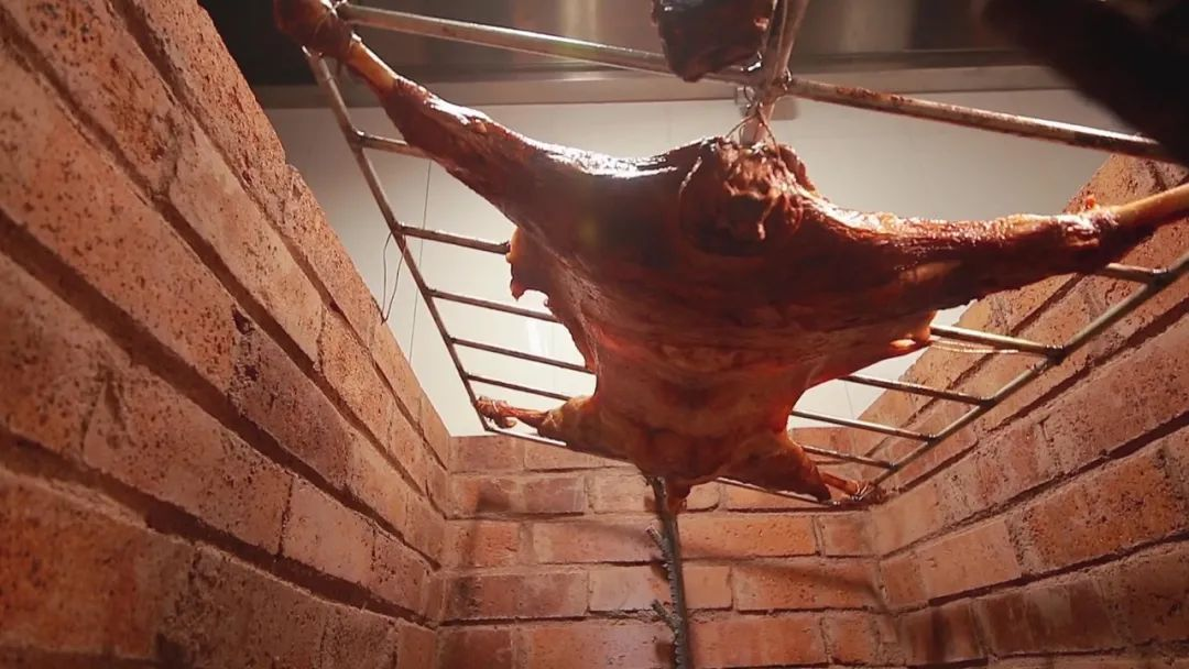 烤制时在羊体涂上由姜葱、胡椒、孜然等调制而成的调料,把整羊置于烤羊架上,以果木或落叶松木屑烤制,独特的香气赋予天然美味“灵魂”。