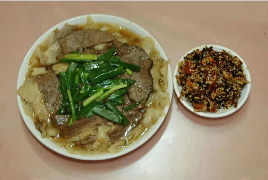 罩饼由烙饼、葱丝、牛肉、汤组成,牛肉色泽红润,肉质肥嫩,饼为荷叶饼,层多,撕成寸大的云彩形状,经百年老汤一勺一勺加热罩透,牛肉和饼松软适口,撒上香葱,吃起来香气扑鼻,味道鲜美。