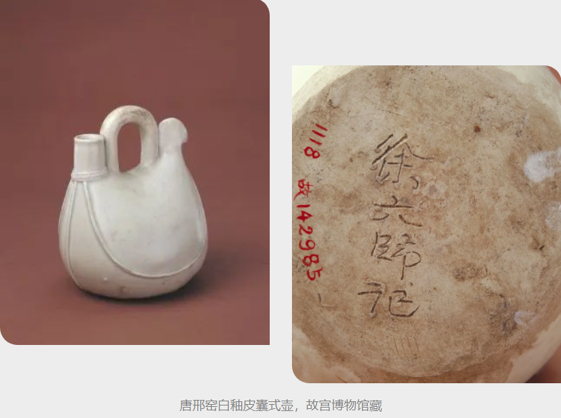·邢窑白釉皮囊式壶唐,通高12.5厘米,口径2.2厘米,底径12.5厘米。壶提包式,上窄下宽,形似袋囊。顶端一侧为短直小流,中间有一曲柄,另一侧饰一曲尾。袋囊的转折处饰有凸起的摺线纹,中间亦饰凸线一道。此壶通体施白釉,在有装饰线的积釉处,釉泛青白色。平砂底,以行草书体刻划工匠名称“徐六师记”四字。