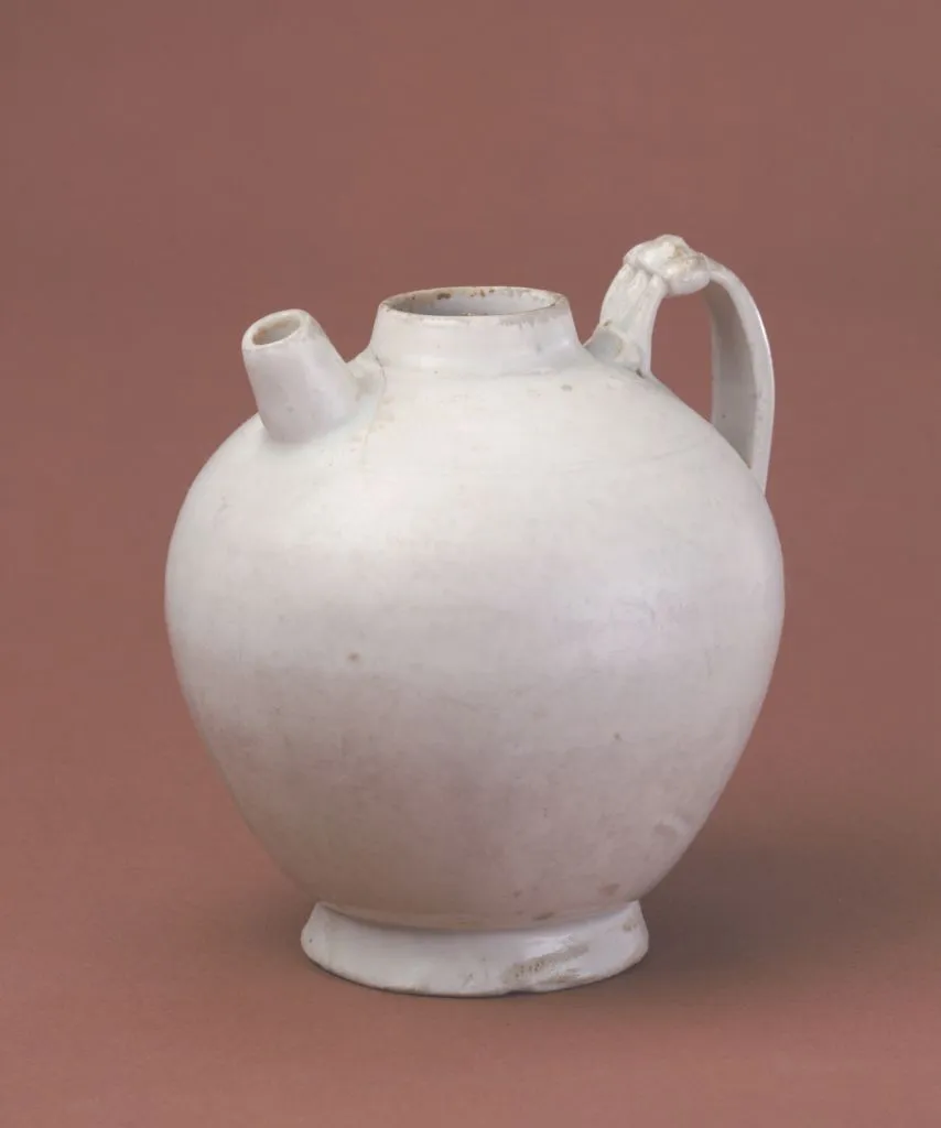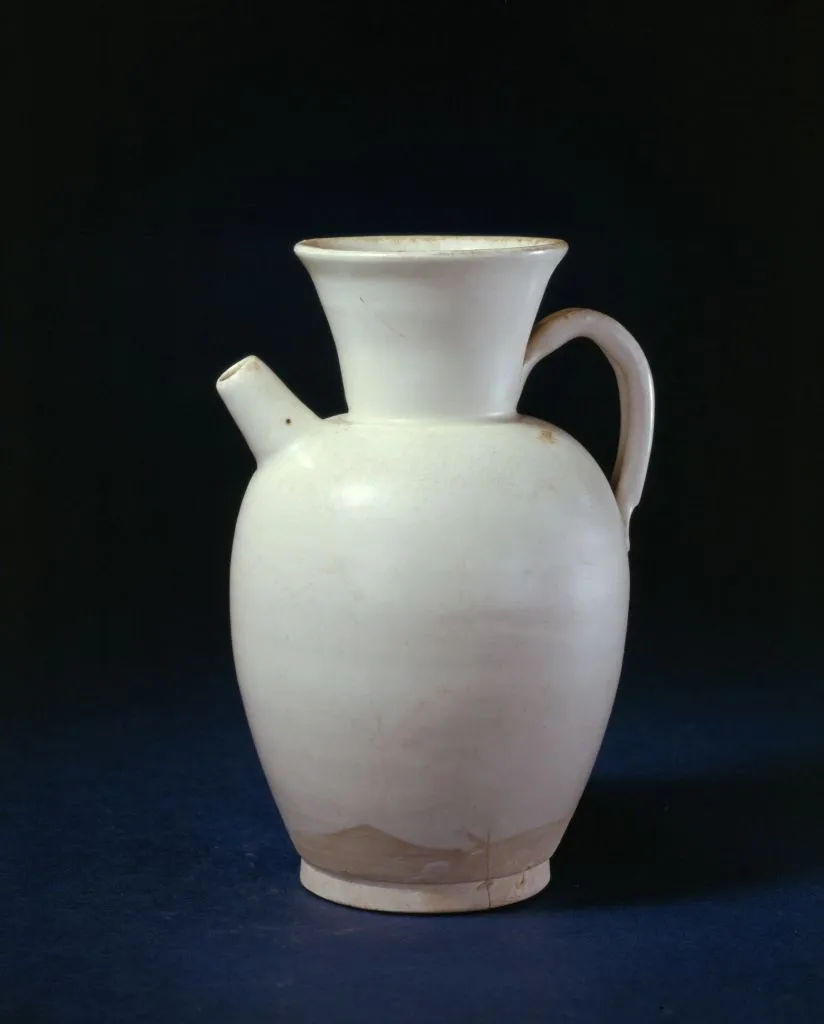 ·邢窑白釉壶,唐,口径7.5厘米,足径7厘米,高17.5厘米。壶敞口,长圆腹,平底,小短流,颈与腹部有曲柄相连。通体施白釉,外部施釉不到底。