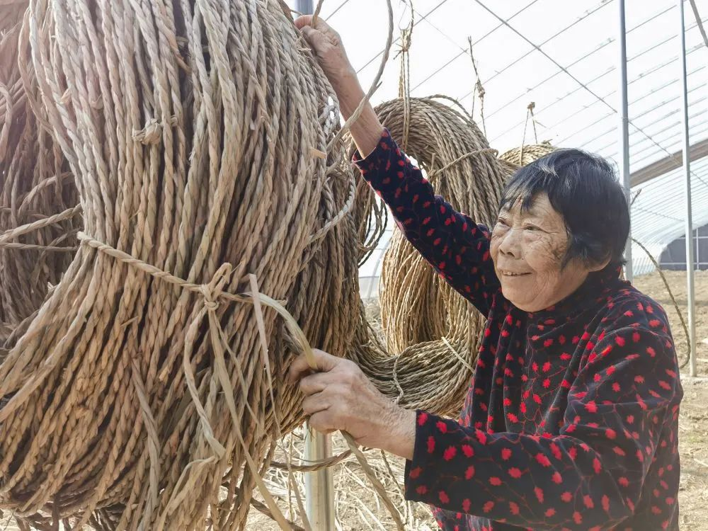 12月25日,安新县大赵庄村村民在大棚内整理编织好的蒲草绳。