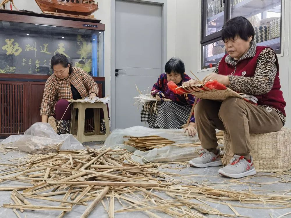 12月25日,在河北雄安赵韵蒲艺农业科技有限公司内,来自山东的蒲草编织老师(右、中)为安新县村民传授蒲草编织技艺。